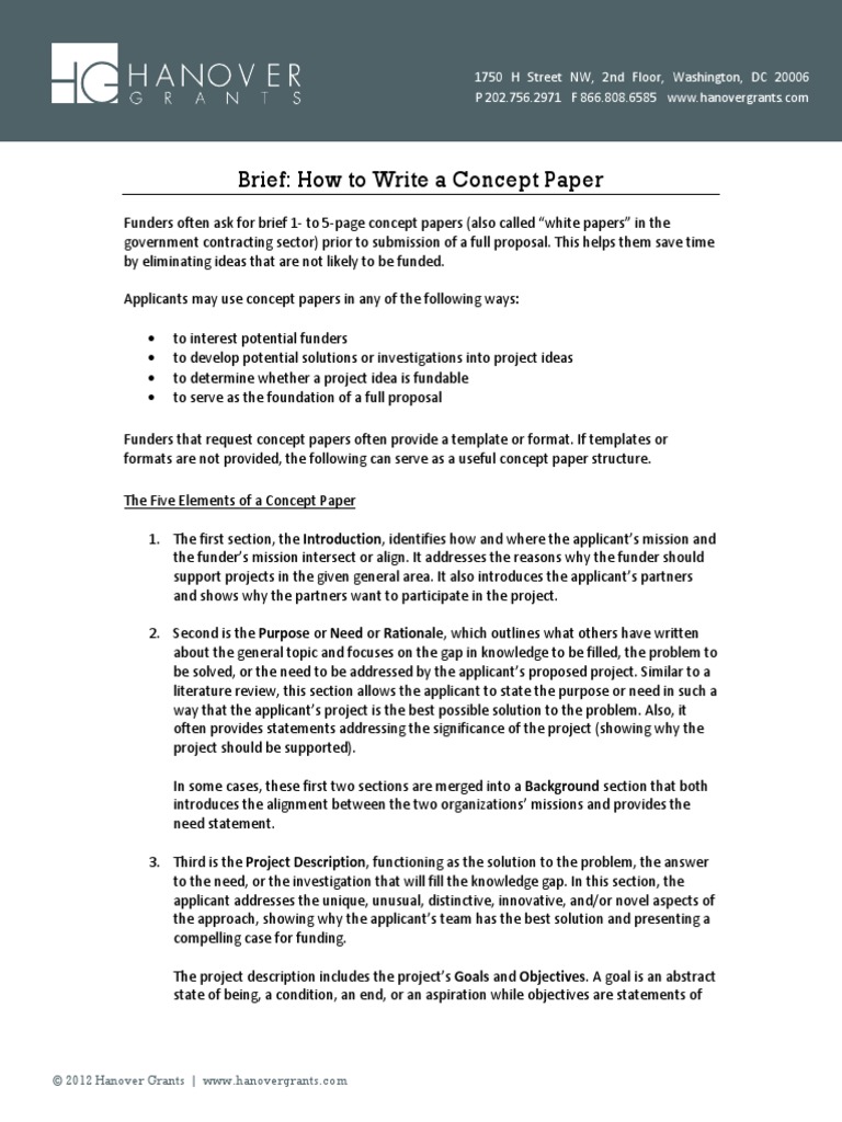 Concept Paper Format Pdf - brownba from brownba.weebly.com Concept paper example pdf a concept paper is an academic written discourse that explains a concept, often about something that the writer is thoroughly familiar with and passionate about.as you will note in the given example, it is a summary structured to highlight the significant parts of a more comprehensive research. What are the various kinds of concept paper? Funders that request concept papers often provide a template or format. The first section, the introduction, identifies how and where the applicant's mission and the funder's mission intersect or align. If templates or formats are not provided, the following can serve as a useful concept paper structure. Why is it important to write a good concept paper? It is a graphical tool that instructional designers engineers technical writers and others use to organize and structure knowledge. Oct 19, 2018 · example of concept paper pdf.